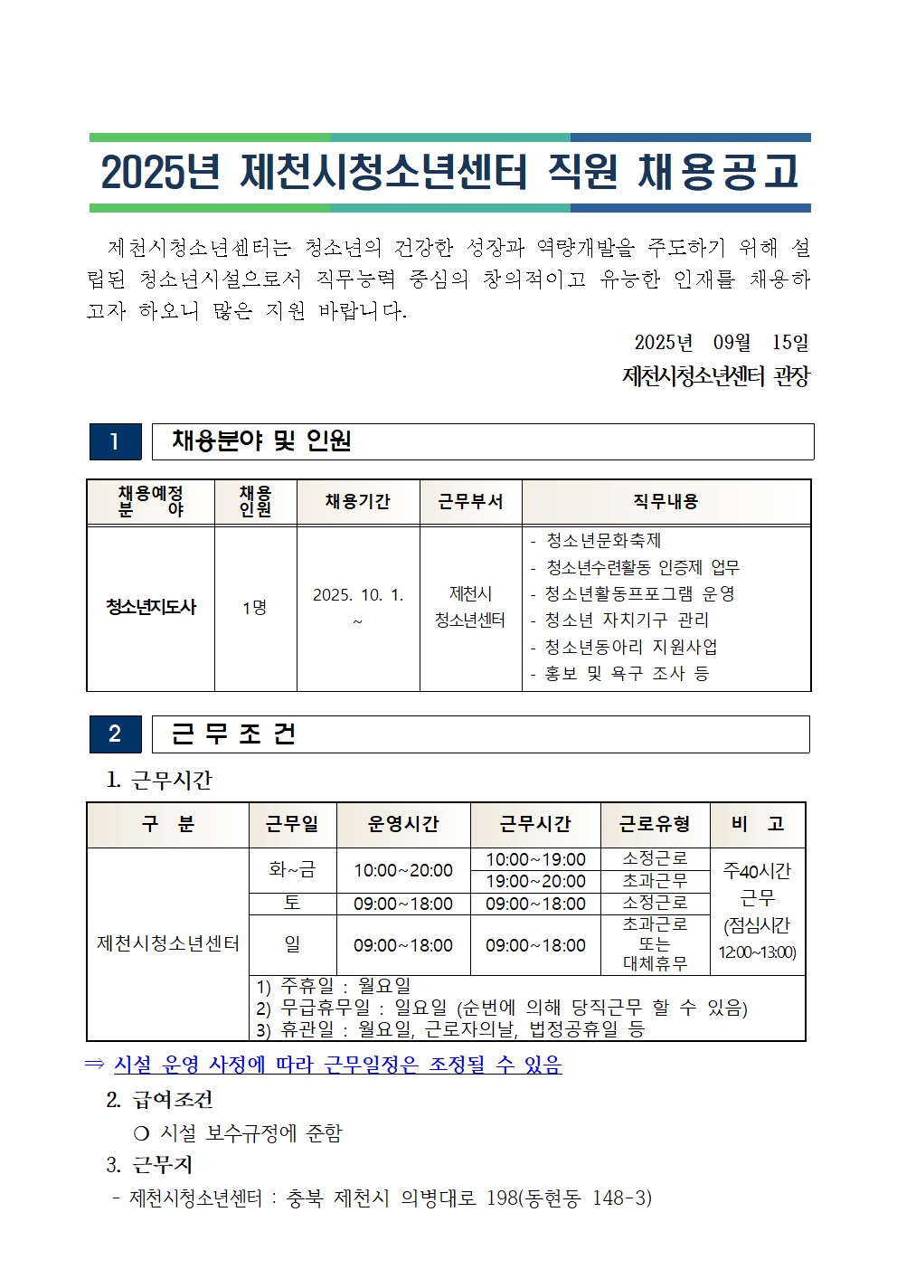 2025년 제천시청소년센터 직원 채용공고