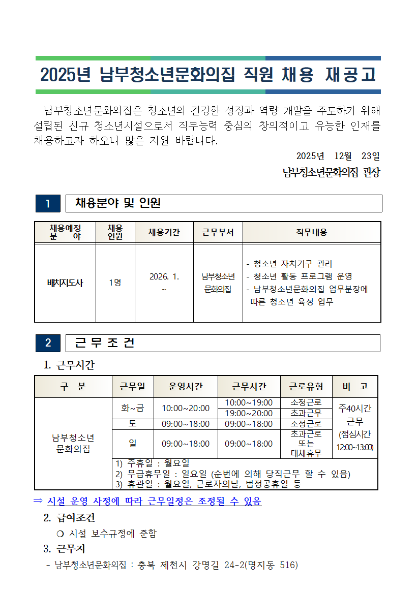 2025년 제천남부청소년문화의집 직원 채용 재공고